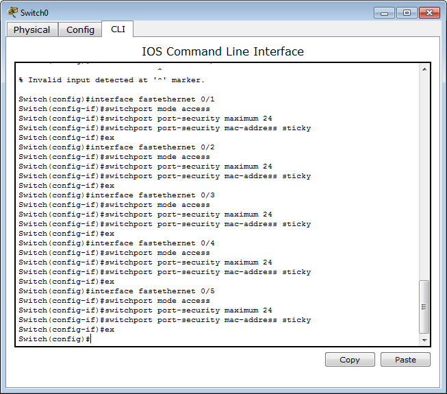 5. Ketikan sintaks/perintah konfigurasi sticky mac-address. Lakukan kepada interface 0/1 sampai 0/5.